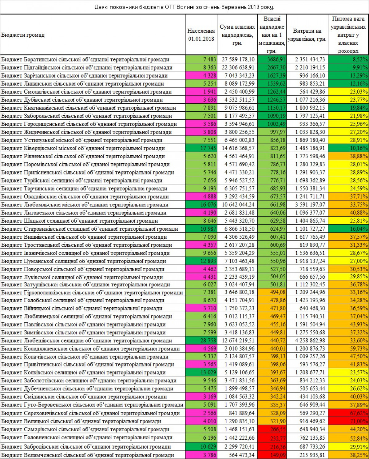Також подаємо до уваги читачів інформацію про доходи місцевих бюджетів в розрахунку на одного мешканця та .питому вагу управлінських витрат у власних надходженнях громад.