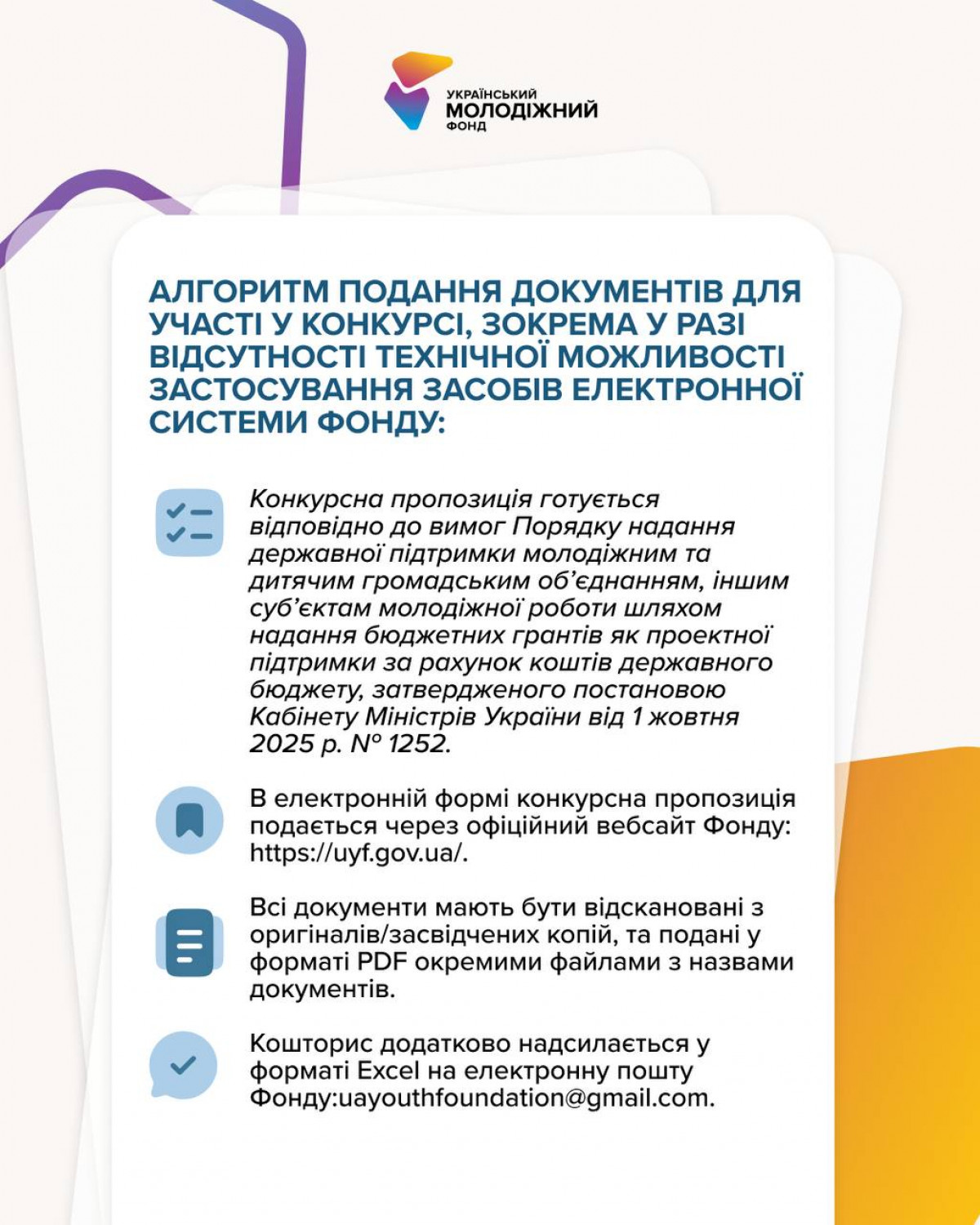 Подати заявку можна на сайті Фонду: https://uyf.gov.ua/. Якщо виникнуть запитання, команда УМФ завжди на зв’язку: +380 97 745 44 83, uayouthfoundation@gmail.com.