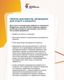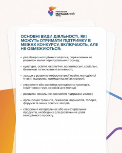 Подати заявку можуть молоді люди віком 14-35 років, що мешкають у невеликих громадах та хочуть реалізувати суспільно важливий молодіжний проєкт.