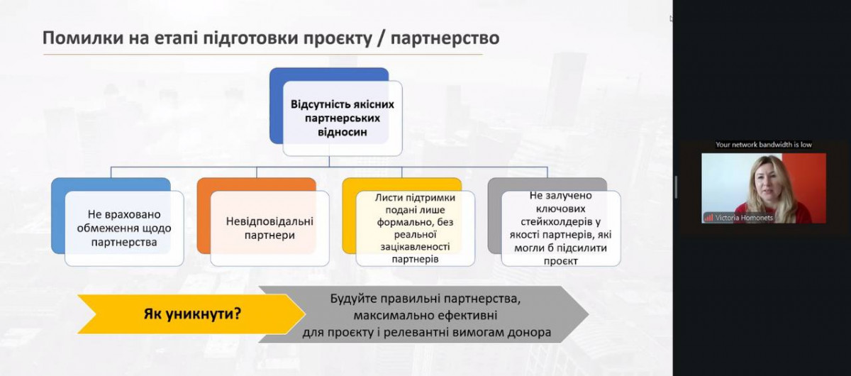Менеджер проєктів консалтингової компанії ProProject Вікторія Гомонець детально проаналізувала типові помилки, які виникають на різних етапах реалізації грантових ініціатив – від планування заявки до фінального звітування та архівування документації. Практичні кейси допомогли учасникам краще зрозуміти, як уникати ризиків і забезпечувати належну проєктну дисципліну.