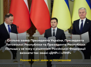 Ми, президенти України, Литовської Республіки і Республіки Польща – держав Люблінського трикутника, зустрівшись у Києві 23 лютого 2022 року, у найрішучіший спосіб засуджуємо рішення Російської Федерації визнати квазіутворення на тимчасово окупованих територіях України – так звані «Луганську Народну Республіку» та «Донецьку Народну Республіку».