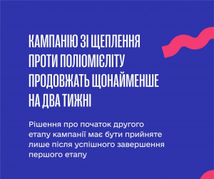 Кампанію зі щеплення проти поліомієліту дітей віком від 6 місяців до 6 років, які мають порушення Національного календаря, продовжать щонайменше на два тижні. Про це під час селекторної наради розповів заступник міністра охорони здоров’я – головний державний санітарний лікар Ігор Кузін.