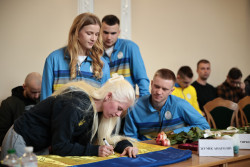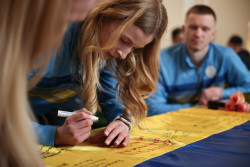 Завершилась зустріч символічним врученням Державного Прапору України, підписаного спортсменами, який вони передали керівникам області на знак єдності, сили і віри у перемогу.