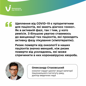 Ризик померти від онкології в пацієнтів з діагнозом “онко” значно менший, ніж ризик померти від ускладнень, які може спричинити в них коронавірусна хвороба. На цьому наголошує Олександр Стаховський, онколог-хірург-уролог вищої категорії Національного інституту раку, доктор медичних наук.