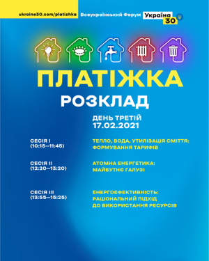 Другий день Всеукраїнського Форуму «Україна 30. Платіжка» відкрив тимчасово виконуючий обов’язки Міністра енергетики України Юрій Вітренко. Разом з ним у дискусії брали участь виконавчий директор компанії ДТЕК Дмитро Сахарук, член групи Європейської комісії з підтримки України Торстен Веллерт, народний депутат України, голова підкомітету Верховної Ради з питань енергозбереження та енергоефективності Сергій Нагорняк, радник віце-прем'єра з питань європейської та євроатлантичної інтеграції Олексій Рябчин та виконавчий директор Асоціації газовидобувних компаній Артем Петренко.